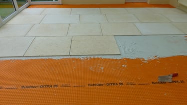 Floor tiles laid on Schluter Ditra decoupling mat to reduce risk of floor tiles cracking due to sub floor movement and cracking after tiling.