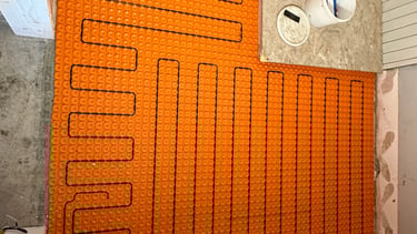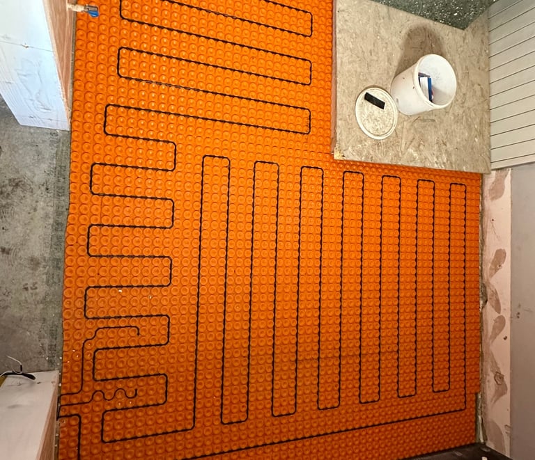 Electric underfloor heating system installed with Ditra Heat Duo PS self adhesive mat, Ditra Heat EHK cable, and Ditra Heat ER6 app controlled thermostat.