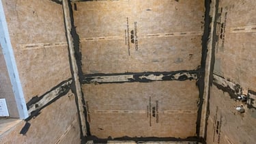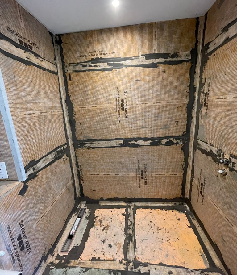 Wet room preparation. Waterproofed existing walls with Schluter Kerdi 200 Membrane; On floor Schluter Kerdi Shower LTS tray and Kerdi Line linear drain